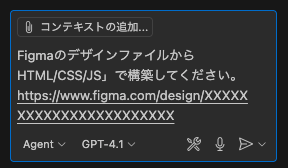 あとはCopilotチャットでFIgmaファイルのURLを添付し、「FigmaのデザインファイルからHTML/CSS/JS」で構築してください。」と伝えるだけで、VSコード内にファイルが作成され数分で構築が完了します。
