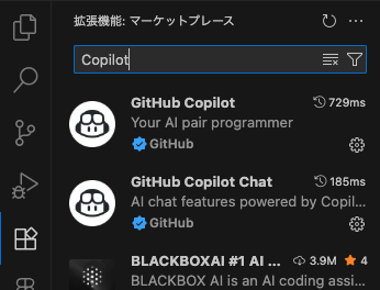 導入できていない方は、「拡張機能」から「Copilot」と検索し、インストールしてください。