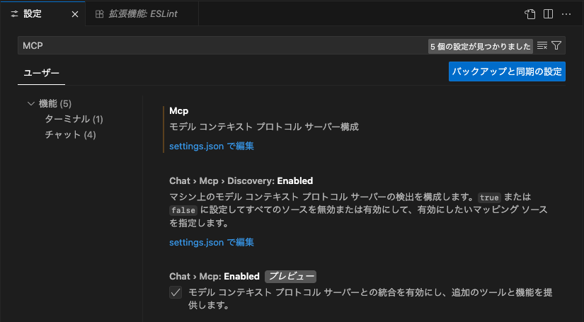 続いて「settings.jsonで編集」をクリックしjsonファイルを開き、以下のコードを入力してFigmaMCPサーバーと接続します。