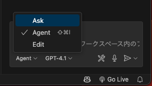 Ctrl+alt(command+option)+BでCopilotを開き、「Agent(エージェント)」モードに切り替えます。