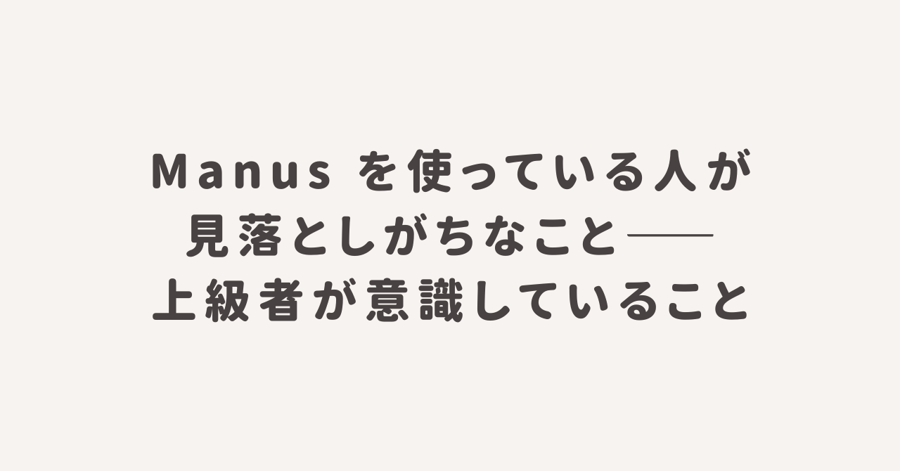 2つ目は、業界知見の補足だ。Manusが拾えない「現場の声」「業界の暗黙知」「最新の動向」は、自分の知見や業界関係者へのヒアリングで補完する。Manusのレポートを「大枠の地図」として、そこに自分の知識を上書きするイメージで使うと、最終的なアウトプットの質が上がる。